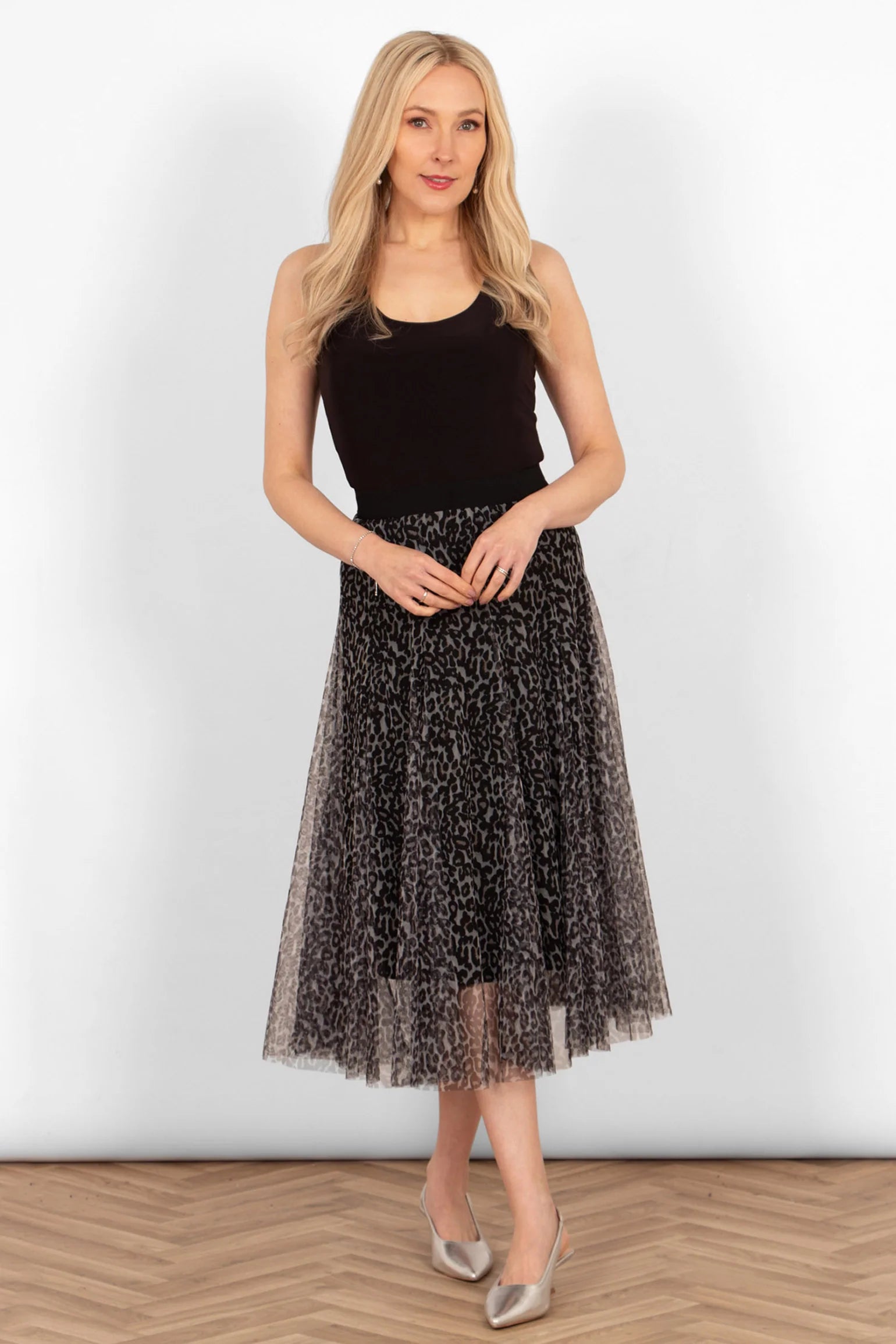 Crafted from lightweight tulle and paired with a matching soft underskirt, this leopard print swing skirt is a versatile occasion piece. Showcasing a floaty layered aesthetic and an elasticated waistband, this midi skirt is designed to flatter.
