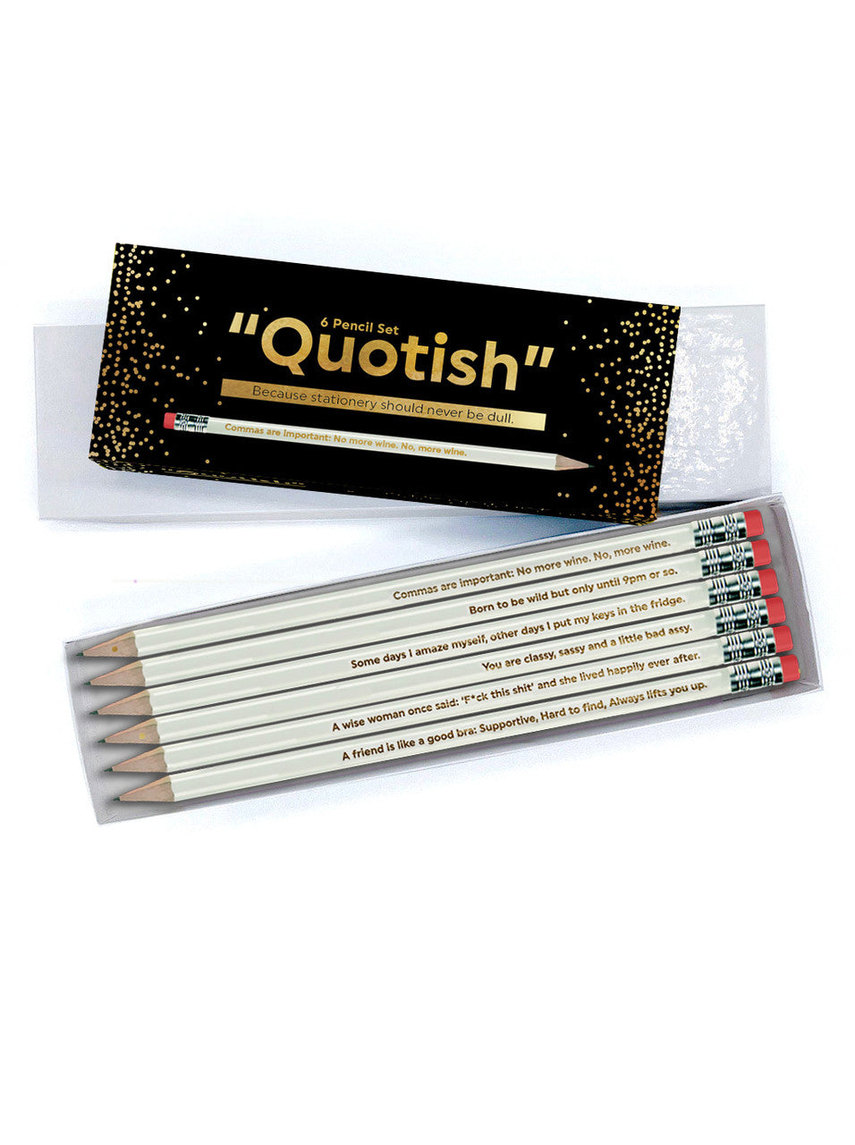 6 awesome pencils with humorous quotes in gold foil, packaged in a gorgeous box and bellyband package, ideal for a little gift.