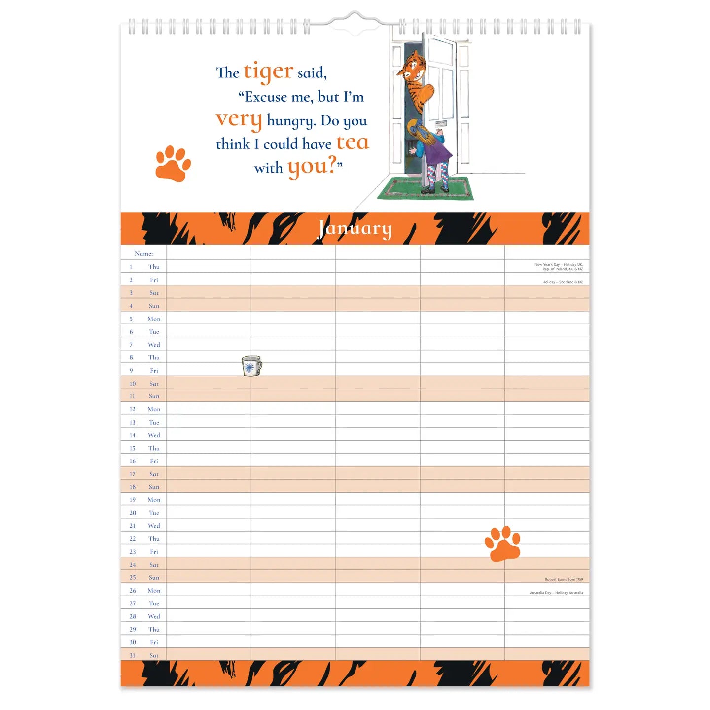 2026 Tiger Who Came to Tea A3 Family Calendar. Share in over 50 years of magic with the delightful story of the Tiger Who Came To Tea. Featuring classic artwork by Judith Kerr, this much-loved story continues to be a favourite with children and adults alike.